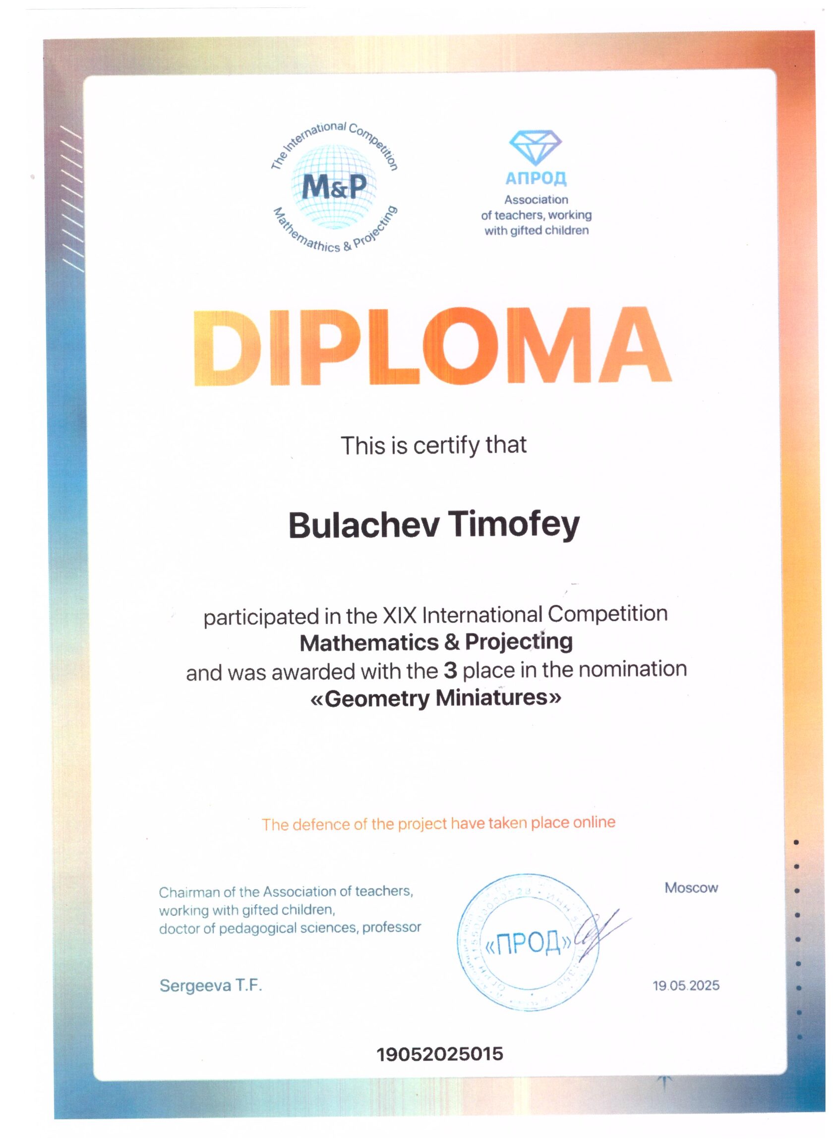 Призер XIX Международного конкурса "Математика и проектирование"