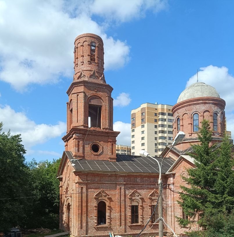 Строительство храма началось в 2015 году исключительно на средства, собранные от жителей. Сейчас завершили возведение верхнего яруса колокольни — осталось уложить всего 10 рядов кирпича. После этого строители приступят к установке купола на колокольню.